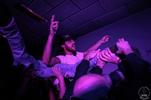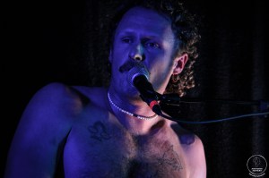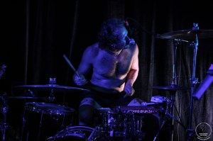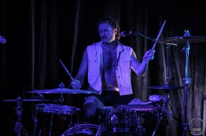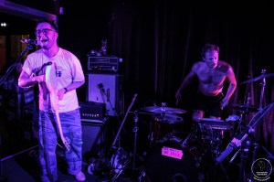 La file se résorbe tout juste au bar que les Naked Soft Men font une entrée tonitruante sur scène, se frayant un chemin dans la fosse au son d’une introduction particulièrement festive. Chacun prend place derrière son instrument et c’est parti pour le show. Paul démarre les hostilités derrière le micro, dans une ambiance brute et festive. C’est ensuite au tour de Jonathan de donner de la voix, sur une majorité des titres, avec un effet de reverb nous plongeant en plein post-punk. Paul fait le show derrière ses fûts. La basse de Florian vibre fort. L’ensemble est un parfait croisement de post-punk et de garage, conférant une vraie identité au groupe, dans un équilibre parfait. La complicité entre les musiciens sur scène est visible et participe à l’ambiance de partage ressentie dans la salle. Naked Soft Men joue avec les rythmes et les effets. Jonathan comme Paul vivent chaque mot qui résonne dans la salle. Le set monte en intensité et les premiers pogos apparaissent timidement. Puis viennent les premiers slams, eux aussi un peu hésitants. Et enfin la salle se déchaîne joyeusement et sans retenue. La fin de set est démentielle, Jonathan descendant dans la foule, comme pour entraîner le pogo qui n’en a nullement besoin! Le concert s’achève sur un mic drop correspondant tout à fait à l’esprit parfois décalé du groupe, et bien mérité après avoir retourné une Bulle complète un lundi soir.