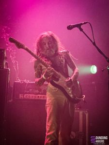 C’est devant une fosse déjà bien remplie que Temple Fang montent sur scène pour ouvrir cette belle soirée. D’entrée on se retrouve plongés dans leurs univers avec des morceaux longs qui laissent les ambiances s’installer. Les riff sont magistraux et les rythmiques alternent entre douceur et énergie brute avec des entre-deux parfaitement gérés. Le groupe néerlandais est également servi par un mix son absolument parfait qui rend honneur à chacun de leurs titres de la plus belle des manière, rendant le set toujours plus agréable à suivre. Dennis Duijnhouwer à la basse nous enchante avec ses rythmiques venant résonner dans nos cages thoraciques. Son jeu complète parfaitement celui de Daan Wopereis à la batterie. Leur nouveau disque Lifted From The Wind étant sorti le mois dernier, le groupe nous en proposera quelques titres pour nous en faire découvrir toute sa diversité sonore. Les riffs de Jevin de Groot et Ivy van der Veer sont vertigineux de maîtrise et nous transportent loin en nous laissant imaginer chacun à notre manière le sens de ces compositions. Les quatre musiciens semblent d’ailleurs totalement habités par leurs compositions ce qui renforce un peu plus l’immersion déjà très forte. Impossible de rester de marbre devant tant de talent! Le silence qui règne dans la salle laisse tout le monde profiter au mieux de cette leçon de rock psyché de haut vol. Le groupe termine avec une dernière vague sonore des plus enthousiasmantes puis quitte la scène sous un tonnerre d’applaudissements largement mérité! On espère les voir revenir très vite dans la région mais vu les sourires sur leurs visages on en doute pas une seconde! Temple Fang ont ouvert cette soirée de la plus belle des manières et de notre côté on note dans un coin de notre tête qu’on va devoir se repasser au plus vite leur discographie!
