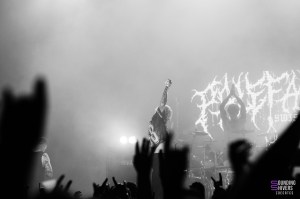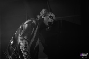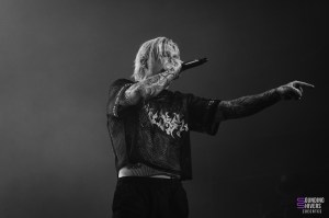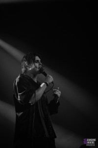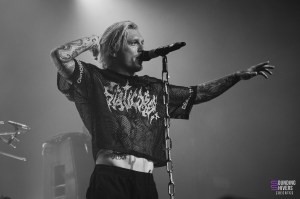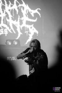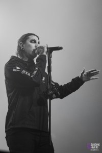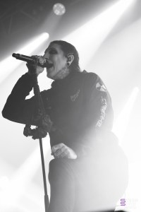 Juste le temps d’aller se rafraichir et il fût enfin temps de voir Motionless In White ! Le public est devenu très compact sur les premiers rangs, tandis que le fond s’est clairement clairsemé, et on va vite comprendre pourquoi. Dès le premier titre « Disguise », le public chantera à plein poumons, et on comprends très vite qu’on est face à un public de fan qui vont donner de la voix, peut-être même plus que de bouger. Aucune parole n’est loupé dans les premiers rangs, et tout le monde peut en profiter puisque 3 écrans sont installés en fond de scène, retransmettant en direct les images des artistes et publics. Nous n’avions encore jamais vu ça à L’Aéronef, ce genre de diffusion sur écran étant plutôt réservé aux capacités de salles plus importantes. Chris Motionless au chant est assez calme, pendant que Justin Morrow à la basse court partout, sous son look de clown effrayant. Après le deathcore de Paleface Swiss, en sent que l’ambiance est légèrement redescendue, même si certains breakdowns, comme celui sur « Thoughts & Prayers » ont mis tout le monde d’accord. Le fameux « Abigail » viendra faire chanter tout le monde, et lancera le début des slammeurs. Motionless In White nous font nous balader dans plusieurs univers, comme celui de Dexter, ou celui de Matrix, avant de nous plonger dans une salle totalement sombre, gyrophare rouge et alarme sur « Death March ». Visuellement, le groupe se donne beaucoup, et part prendre un drapeau français pour le fameux « Slaughterhouse » avant LE titre que tout le monde attends : « Voices ». Un doublage vocal se fit entendre, dommage pour un groupe de cette envergure, mais le public n’y prêtera pas attention. L’auditoire fût conquis, et nous avons clairement senti un engouement certain sur les titres de leur album Graveyard Shift, sorti en 2017. Motionless In White enchaineront les morceaux, et même si on sent que le public était là pour chanter en chœur, il manquait clairement ce petit truc en plus qui fait de leur concert un moment inoubliable.