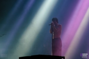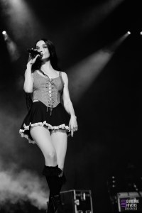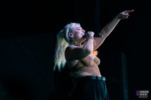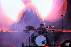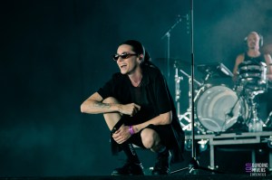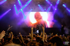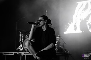 Pour continuer sur une note assez légère, on se dirige vers la scène d’à côté pour retrouver l’électro-pop de PVRIS qui apporte une ambiance plus calme mais toujours prenante. Mélodies dansantes, voix maîtrisée, quelques slams… Lynn Gunn se balade sur scène micro à la main ou guitare entre les doigts, nous entraînant sans problème dans son univers. Cette année représente d’ailleurs les dix ans de leur premier album White Noise, c’est l’occasion pour nous d’y retrouver des titres phare comme « St Patrick » ou encore « Fire ». L’ambiance générale est flottante, presque éthérée par moments ce qui rend ce moment un peu plus suspendu dans le temps. Le set se clôt sur l’incontournable « My House », repris en chœur par tout le chapiteau.
