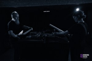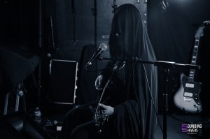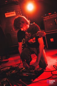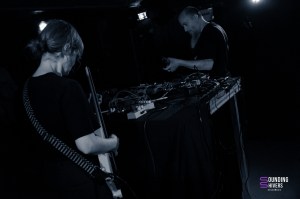 On démarre donc la soirée avec Sunwell, proposition musicale/ poétique de la part de Elya que l’on connaît déjà notamment dans Deûle, Ladeûlas, Otto Ruth ou encore Death By Fog, ou Morveux. En bref, l’une des artistes les plus prolifique de la scène Lilloise, et également une des fondatrices de GZL VNR. Drapée de noir de la tête aux pieds, nous avons l’impression de faire face à un figurine de la nuit venant nous raconter ses aventures passées. Ami amoureux de câble management, vous n’allez pas être déçu. Elya maîtrise à merveille les différents effets, textures, nappes sonores qu’elle amène avec sa guitare et sa voix durant sa prestation. Une scénographie très minimaliste au milieu de cette scène, pivotant sur sa chaise entre les deux pedalboard, Sunwell remplie son rôle de conteuse d’histoires à la perfection, le public s’asseyant pour ne louper aucune miette. Un set très intimiste qui a permis de rentrer de la meilleure des manières dans cette soirée.