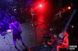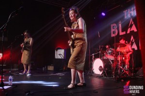 Après cette délicieuse mise en bouche, passons maintenant au plat de résistance, que dis-je, au hors d’œuvre. C’était dans la plus grande joie qu’on trépignait d’impatience en les attendant tous et toutes. Qui ça ? J’ai nommé The 5.6.7.8’s. Formé à Tokyo en 1986 (rien que ça…) le trio remue ciel et terre dans l’univers pêchu du Rock n’ Roll depuis maintenant quarante ans cette année. Beaucoup auraient déjà raccroché en laissant tristement dormir leur instruments à la cave et vieillir dans leur flight case à l’abri de la poussière, mais The 5.6.7.8’s ne l’avaient pas entendu de cette oreille. Toujours bel et bien présentes et surtout actives, pour nous servir un max de pep’s sur un savant mélange de Garage Rock / Garage Punk, de Rockabilly, de Rock n’ Roll pur et dur et de Surf Rock, notre trio féminin était là pour nous donner l’impression d’être dans un bon vieux film de Quentin Tarantino. Car impossible de ne pas faire le lien entre The 5.6.7.8’s et Kill Bill. La petite anecdote est qu’en 2002, Mister Quentin Tarantino himself a découvert leur musique dans une boutique de vêtements à Tokyo et les a invitées à jouer leur propre rôle dans une scène de son film Kill Bill. Alors forcément, une bonne partie du public était venu pour avoir le privilège de se sentir en l’espace d’une soirée, dans cette mise en situation bardée de bandits, de flingues et de Rock n’ Roll, sur un air oldies que seul Quentin Tarantino sait nous faire vivre à la perfection. Mais ce soir, c’était à The 5.6.7.8’s de nous donner cette sensation, et à nous aussi de jouer notre propre rôle de bad boys Rock n’ Roll. Et elles l’ont fait à la perfection. Grâce à leur esprit Rock n’ Roll à l’ancienne tout droit sorti des sixties, elles nous ont fait l’honneur et le privilège de nous jouer une floraison de morceaux tout droit sortis de leurs différents albums tout au long de leur carrière, ce qui aura ravi les fans du groupe. On se rappelle encore à quel point nos petites rockeuses étaient plus que sympathiques et généreuses, en prenant le temps d’échanger avec leur public entre les morceaux, nous conviant toujours un peu plus à leur univers, en nous parlant Anglais avec ce petit accent Japonais, agréable et atypique qui nous faisait forcément voyager. Entre regards complices et petits sourires discrets entre elles, on sentait bien que The 5.6.7.8’s se connaissait à la perfection, et ce jusqu’au bout de leur manche de guitare, de basse, et de baguettes. Tout était parfaitement orchestré pour nous faire vibrer avec harmonie grâce à un max de riffs de basse chaude, de solos de guitare généreux, et de rythmiques de batterie saisissantes. Sans oublier de nous offrir, entre leurs différents morceaux, et ce en continuant aisément leur set, leur très connue “Woo Hoo”, chanson avec laquelle elles ont fait leur apparition dans le très célèbre Kill Bill. Et c’est à ce moment précis que le public de The Black Lab perdît pied dans un élan de spontanéité entraînant un joyeux mouvement de foule dans un joli bazar, pour chanter tous en ensemble en coeur et à tue-tête, les Woo Hoo répétitifs et entrainants scandés par notre trio infernal. Avec une jolie collection de singles, quelques EP’s, un album live et cinq albums studio, The 5.6.7.8’s nous aura offert un magnifique live d’un peu plus d’une heure en nous conviant à une soirée d’anthologie retraçant une belle partie de leur superbe carrière musicale, pour nous jouer les hymnes qui ont fait d’eux des légendes du Rock n’ Roll Japonais dans le monde entier.