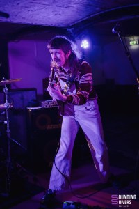 On continue la soirée avec un deuxième trio et une promesse : This Will Destroy Your Ears. Pierre-Johann (chant, guitare) porte un micro casque lui permettant d’être totalement libre de ses mouvements, tout en maintenant un son de belle qualité. Une petite réverb est présente et met une ambiance assez post-punk. Les effets dans la guitare lui confèrent parfois un sentiment lancinant, faisant écho à de riches émotions. Pierre-Johann continue de chanter tout en changeant de guitare. Derrière, Magali (batterie) est tonique et déterminée. La rythmique est claire et carrée. Elle utilise sur quelques passages, un grelot en guise de deuxième baguette, modulant ainsi les sonorités, et donnant un aspect un peu plus expérimental et original. Pierre-Johann lui aussi innove en tapant sur ses cordes de guitare avec un petit objet métallique. Il confère ainsi un son grave à la guitare, accompagné par la basse lourde, et contrastant avec les grelots légers. Certaines compositions sont assez graves, presque lourdes. Elles sont mises en contraste avec celles plus légères, rythmées et presque festives, à l’instar de “Ready to Go”. Les émotions véhiculées sont complexes, mêlant joie, mélancolie, et même parfois résignation. Par moments, Léa (basse), de retour à la Malterie après son passage avec Péniche début octobre, prend également le chant pour former un duo qui se répond dans une belle énergie, parfois presque a capella. Certains passages évoquent le groupe de post-punk Structures. Les titres sont efficaces, et on vous invite vraiment à découvrir “This is Why” si ce n’est pas déjà fait. Le trio montre un plaisir à être sur scène et une belle complicité. On termine ce concert sur un titre particulièrement prenant et assez long. This Will Destroy Your Ears quitte ensuite la scène au son de “Pump up the Jam”, applaudit par un public conquis.