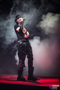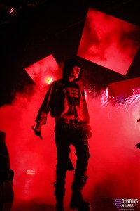 Next up is Aimé Simone, accompanied by his partner and artistic director Sonja. The stage design is striking at first glance: a diamond-shaped platform occupies the back of the stage, illuminated by the bright red logo of his latest album, perfectly matching the artist’s outfit, which several audience members are also wearing. Aimé Simone offers a hybrid universe, mixing pop and emo rap, supported by intriguing visuals in the background, some of which seem to have come straight out of AI (we hope not, to be honest). The audience, already won over, sings along to the lyrics of hit songs such as “Don’t Forget Who You Are,” an anthem to self-acceptance. Between songs, the artist explains the concept of his album, designed as a journey through different musical genres, where the intonation of his voice varies according to the emotions he wishes to convey. The setlist illustrates this diversity: after an ethereal interlude with house accents, introduced by storm sounds and a stage filled with smoke and strobe lights, comes “Gore Mode,” dark and disturbing, punctuated by Michael Jackson‘s iconic laugh in « Thriller ». Then, in an unusual moment, Aimé Simone starts a mosh pit to “LALALA,” even detailing how to do it. This is quite unusual for rock and metal concertgoers like us, where such impulses arise spontaneously. The energy drops slightly, with the audience seeming more receptive to the electro passages that evoke a club atmosphere. The artist plays with the symbolism of the evening, evoking the full moon before performing his track featuring Pete Doherty, to the wolf-like howls of the audience. A more intimate section follows, with guitar and vocoder in hand, with a moving cover of “Hallelujah” in the vein of Jeff Buckley. The concert ended with “Not What You Wanted,” punctuated by another mosh pit, before an encore… which the artist also took care to explain, inviting the audience to shout for his return. Let’s be honest, we still find it rather curious to explain what an encore is, but so be it.