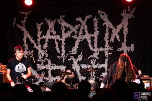 Ca y’est l’heure est arrivée de retrouver les légendes de Napalm Death sur scène! Le public est aux anges et la foule est compacte pour être au plus près de la formation anglaise. Lorsque « Instinct Of Survival » démarre on se rend vite compte que Shane Embury n’est pas présent ce soir, ce que Barney Greenway expliquera plus tard en nous rassurant sur son état de santé et en remerciant Adam Clarkson d’être présent pour assurer les parties de basse. Barney est d’ailleurs en excellente forme et court dans tous les sens, comme à son habitude sur scène en enchaînant les titres cultes de la formation. Le groupe ravit le public avec le on ne peut plus indispensable actuellement « Continuing War On Stupidity » avant de poursuivre avec « Everyday Pox » et « Contagion ». La vitesse des morceaux n’a d’égal que la qualité de la prestation et des messages véhiculés. Car oui Napalm Death n’ont pas oublié leur discours antifasciste ou encore leurs positions sur la guerre et la religion. Des messages importants à remettre sur le devant de la scène en ces temps troublés. John Cooke enchaine les riffs percutants et délivrés à la vitesse d’un TGV pendant que Danny Herrera s’active derrière les fûts avec brio! Le grind de Napalm Death ne prend pas une ride et des titres comme « Narcissus », où Barney évoquera l’homme orange a la tête des USA, ou encore « When All Is Said And Done » ne font que relancer inlassablement le pit et les slams. La puissance du set ne faiblit pas et même les morceaux les plus courts comme « Dead » viennent nous coller un peu plus le sourire. On se régale et voilà déjà l’heure du cultissime « Suffer The Children » qui laissera à notre hôte l’occasion de repasser un message très fort surtout avec l’actualité brulante de ces derniers mois. Le groupe nous offre ensuite une cover pas piquée des hannetons de « Incinerator » de Slaughter en rappelant à quel point le groupe les as inspiré. Barney ne cesse de courir partout et semble infatigable mais on sait qu’on arrive après déjà plus de 17 morceaux jouées vers la fin du set. Mais il reste encore de quoi bien profiter avec par exemple le génial « Scum ». Mais le set prend une autre tournure avec l’arrivée du morceau de deux morceaux de légende : « You Suffer » d’abord avec sa durée d’une seconde puis l’indispensable « Nazi Punks Fuck Off », cover des Dead Kennedys, qui fera sortir les quelques personnes citées plus haut de la salle! On ne peut que s’en réjouir et rappeler que les idées fascistes n’ont pas leur place sur la scène punk et sur tout autre scène qui soit d’ailleurs, ni même dans la société. Un morceau salutaire à l’heure de la montée des extrêmes droites partout en Europe et dans le monde! La formation jette ses dernières forces dans la bataille avec « Persona Non Grata » et « Smear Campaign » en nous laissant sur des riffs imparables et des vocalises toujours aussi impressionnantes de Barney! On quitte la salle ravis par ce set qui aura rappelé à quel point musique et convictions politiques sont liées et à quel point un groupe comme Napalm Death nous rappelle années après années que leurs combats vont vers plus d’inclusivité et toujours plus de justice sociale et d’anti racisme!