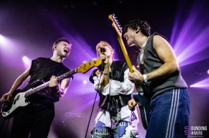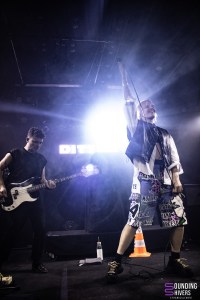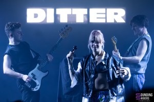 On enchaîne assez vite avec Ditter, déjà bien rodés à la scène de l’Aéronef car ils ont joué pour les enfants et leurs parents dans l’après midi en goûter concert (une initiative de la salle qu’on ne peut que saluer). Le trio débarque et se lance directement dans son mélange post punk et pop bien dansante. Rosa-Maria Roca, François Crépu et Samuel Hecker savent faire et nous enchantent avec des morceaux énergiques et taillés pour le live. Evidemment leur dernière sortie, Cringe is the new sexy, est mise en avant mais le trio n’oublie pas également ses précédentes sorties pour le plus grand plaisir des fans présents ce soir. Dans la fosse ça remue, ça fait la fête et ça pogotte un peu. On est étonné que vu l’énergie qui se dégage des titres du trio la fosse ne soit pas devenue un véritable dancefloor plus rapidement. De notre côté les titres nous ravissent et le mélange guitare, basse et chant électrisant nous comble et nous fait danser de plus belle. On adore ce qu’on entend et chaque titre livre son lot de combats importants dans les textes. Rosa-Maria n’hésite pas à nous demander si il y a des gens qu’on déteste ou encore de crier notre colère à la société. Un set bien puissant et salvateur en cette période de plus en plus anxiogène. Finalement ce soir c’est la musique qui gagne avec Ditter, car leur énergie a sur pendant un peu moins d’une heure nous donner l’énergie d’avancer en dansant, et franchement que demander de plus pour un samedi soir de qualité. Le groupe termine son set en prenant le plot de chantier marqué d’un gros « ANTIFA », également écrit sur l’arrière de la guitare et nous invite à tout donner dans un gros dernier pogo bien fort et bien cathartique comme on les aime! Une bien belle fin de set qui montre que les combats du trio sont au coeur de cette pop post punk qui tout en étant taillée pour faire danser véhicule des messages forts et importants. Le public quitte la salle comblé et prêt à remettre ça très vite. Il faudra clairement compter sur Ditter dans les années à venir et on vous encourage à foncer les découvrir si ça n’est pas déjà fait.
