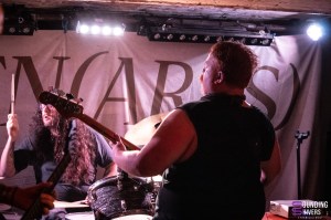Place ensuite à Yarostan, tout droit venu de Marseille. Si vous nous lisez régulièrement, vous connaissez notre amour pour le screamo, encore plus lorsqu’il est chanté en français. Autant dire que nous attendions ce concert avec une certaine impatience, leurs sorties tournant déjà en boucle chez nous. Et le moins que l’on puisse dire, c’est que le quintet n’a pas déçu. Le set s’ouvre avec « Cathédrale de Poussière », morceau inaugural de leur dernier album III. L’atmosphère change instantanément : ici, plus question de riffs bien gras, mais d’un screamo mélodique et viscéral, traversé par un chant crié depuis les tripes, parfois même loin du micro, ce qui ne fait qu’amplifier les frissons. Au premier rang, plusieurs spectateurs reprennent les paroles à l’unisson (on plaide coupable), et la connexion se crée immédiatement. Sur scène, c’est une véritable déferlante : les cinq musiciens bougent sans cesse, portés par l’énergie d’un mur de trois guitares qui s’entremêlent, parfois au point de se confondre, sans jamais nuire à la force émotionnelle de l’ensemble. Le temps se suspend avec « Godot », ses huit minutes foisonnantes de changements de rythmes et d’ambiances. Un moment de grâce absolu. Yarostan livre ici une performance bouleversante, et nous quitte avec la certitude d’avoir assisté à quelque chose de fort.