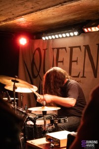 Il est enfin temps de célébrer Queen(Ares) et Choices, fraîchement sorti le jour même via Source Atone Records. Le quatuor est entouré de nombreux ami.es et fans, et c’est sous un tonnerre d’applaudissements que le groupe investit la scène. L’introduction, tout en douceur, issue de l’album, installe un faux calme avant de s’effondrer sous une vague post-metal dévastatrice. Le public répond immédiatement, headbanguant en parfaite synchronisation avec la section rythmique tenue par Alex et Nico. Après ce premier uppercut, Maxime prend la parole, non sans humour, rappelant qu’ils sont heureux d’avoir enfin pu jouer un morceau en entier à la Malterie, clin d’œil à leur précédent passage écourté après la blessure de Charly, emporté par les pompiers au bout d’une minute de concert. Ce soir a clairement un goût de revanche.