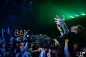 Ensuite tout s’accélère, MDNS demande si le public a écouté son dernier EP, DRACHE!, avant de solliciter la participation du public pour le refrain de “Sexe, Drogue & Drame” sur la phrase “Ça pue la merde”, de la très grande écriture comme en rigole MDNS. Même sans incitation, la foule ne se prive pas de reprendre les refrains en chœur. Ensuite, “Téléphone” et “La Faute à Qui” conservent cette énergie folle. MDNS court et saute dans tous les sens tandis que les musiciens s’attèlent parfaitement à leur tâche avec une ardeur similaire, et dans la foule, cette énergie est tout aussi palpable. Les pogos éclatent régulièrement et s’agrandissent au fur et à mesure que le concert avance, quelques personnes slamment, mais tout le monde saute et crie à en perdre la voix.