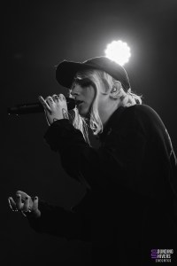 Next up is Théa, and the concert kicks off with a bang. The drummer takes his place behind his toms whilst the guitarist positions himself on a platform to the right, and so the track “h4rdr0ck3r” begins. Théa, meanwhile, appears at the centre of the stage, also on a platform. The stage design is nothing grandiose but it more than holds its own; the large letters in the background make an impact as they start to flash and come to life with different textures throughout the evening. The packed Aéronef echoes with the audience’s shouts of joy; at the same time, it’s the ideal choice of track to introduce the artist, with an entrance that matches her energy. At the end of the track, she mentions that her voice took a bit of a knock at the Olympia a few days ago, a show that sold out seven months in advance. She then follows up with “Hannah Montana”, then a warm-up that’s almost unnecessary as the crowd is already shouting along with her before launching into “Y a rien à faire p*****”. The atmosphere in this packed Aéronef seems entirely devoted to singing, screaming, jumping and dancing, but Théa doesn’t hesitate to ask for even more: “Is it possible to turn the Aéronef into a bloody massive party, please?”; everyone responds enthusiastically.
