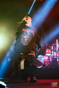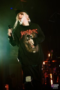 S’il y a une personne qui peut ramener la tecktonik sur scène, c’est bien Théa. Sa musique emprunte beaucoup aux codes des années 2000 ; en même temps, on y a grandi. Théa, ce n’est pas que des chansons de révolte, c’est aussi des morceaux parfois intimes, de rupture et bien plus calmes comme “Anxiolytique” ou encore “LHPTL”, qui arrive plus tard et met facilement les larmes aux yeux. “Enfant d’la rave” s’ouvre avec une bande annonçant “Génération psychiatre, Révolution Techno” et, avant de lancer un wall of death, la chanteuse en profite pour faire un tour dans la fosse. L’explosion arrive ensuite, provoquant aussi les premiers slams de la soirée. “FASTLIFE” arrive, calmant un petit peu le jeu à nouveau, avec cette phrase souvent utilisée pour décrire Théa : “J’suis pas une fille, j’suis une comète”. Mais cett